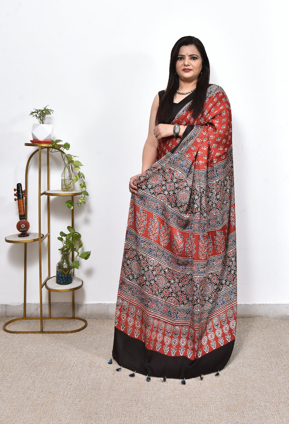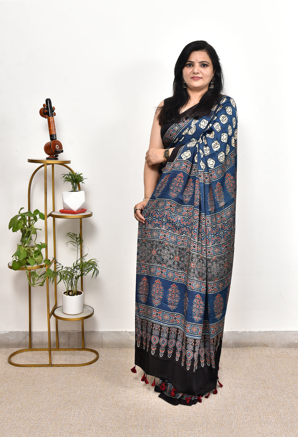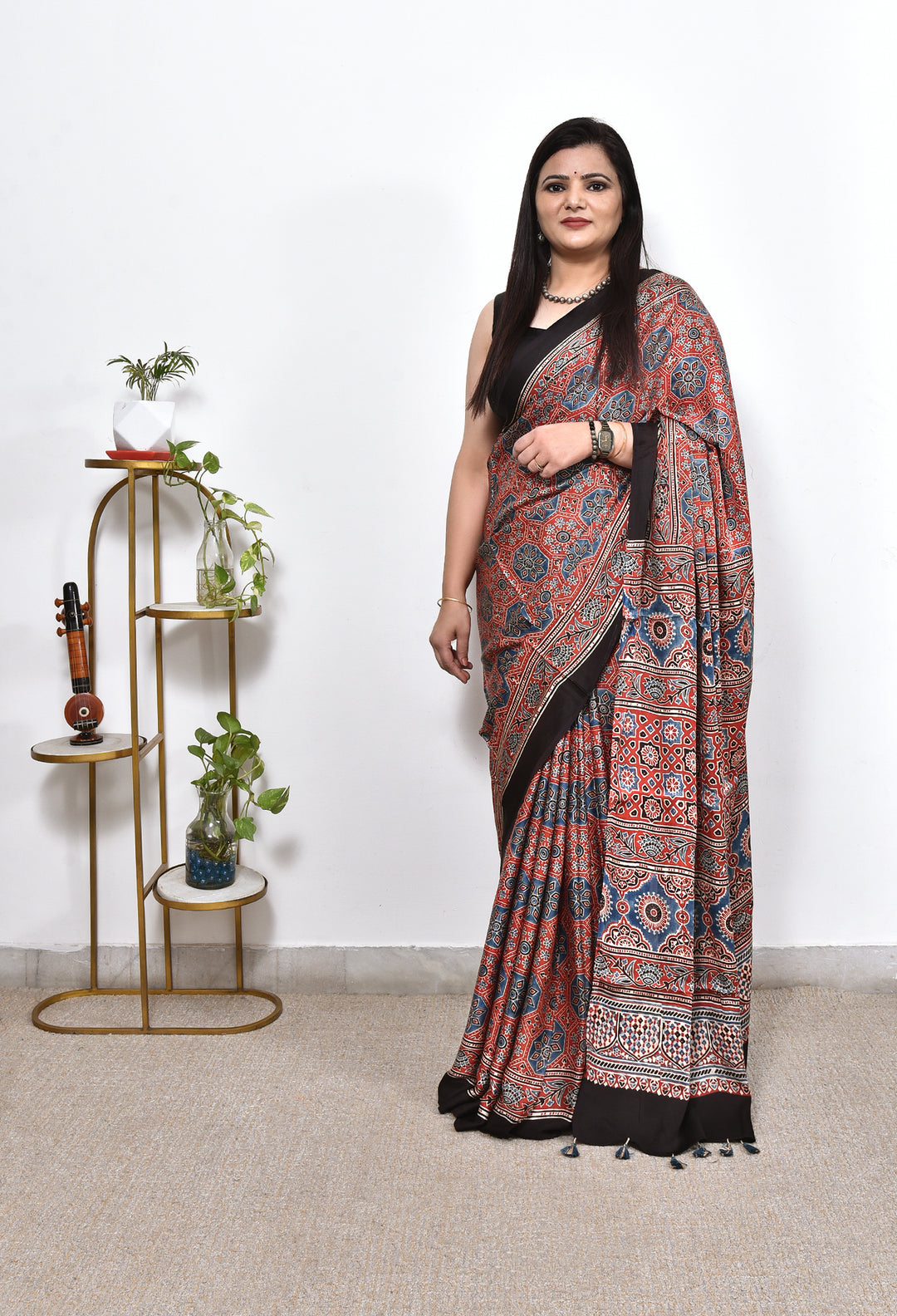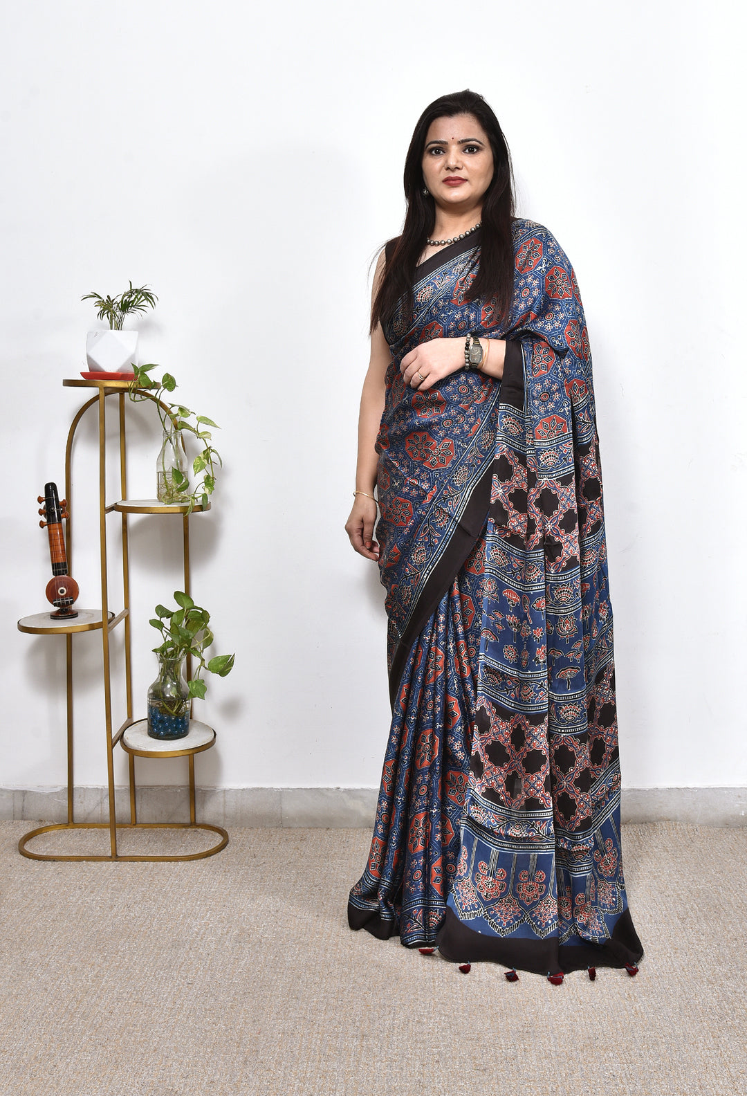 Ajrakh Silk Sarees are not just fabric , they are a masterpiece of Indian craftsmanship, a testament to the rich heritage of Kutch and Rajasthan. These sarees, are renowned for their intricate designs, vibrant natural dyes, and cultural significance, and are also a symbol of India's textile legacy. Unlike mass-produced alternatives, each Ajrakh saree is a unique creation, handcrafted with love and care by skilled artisans.