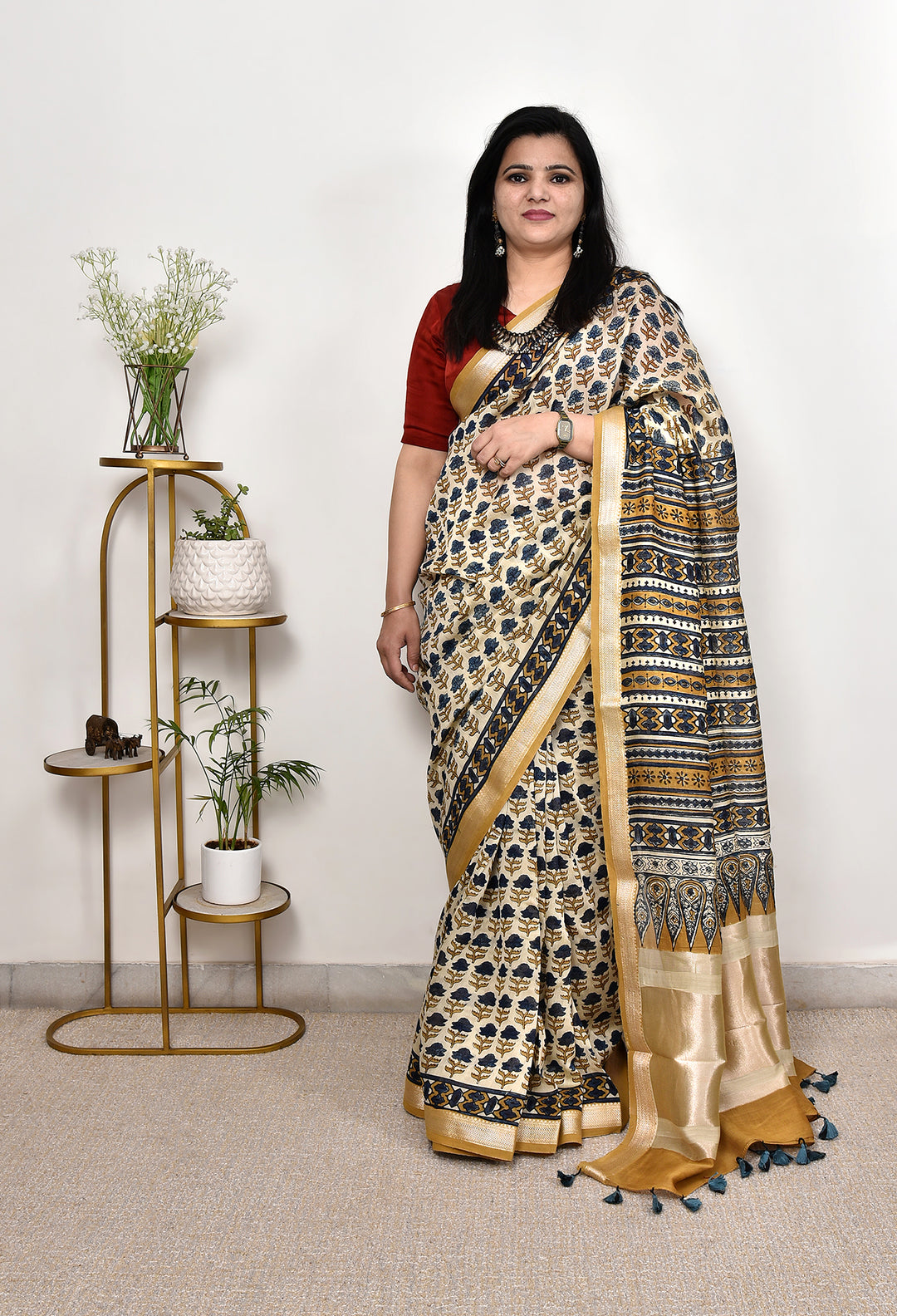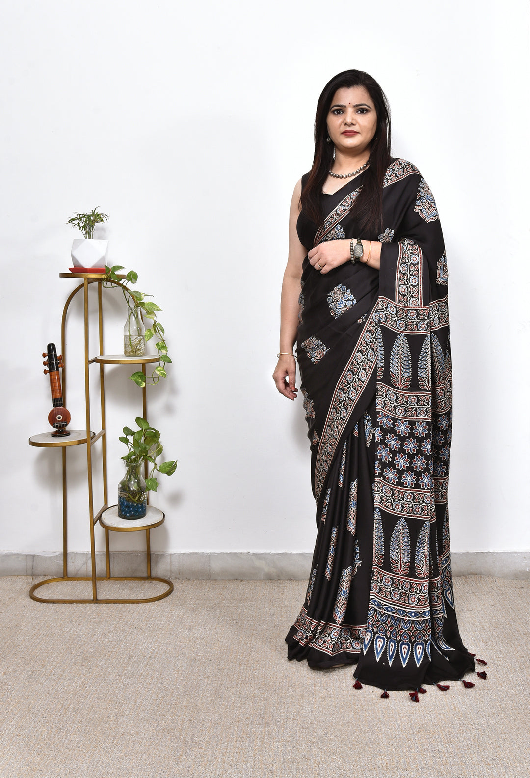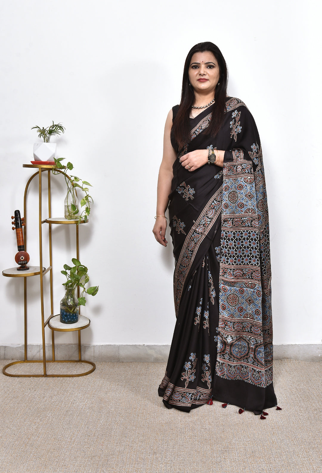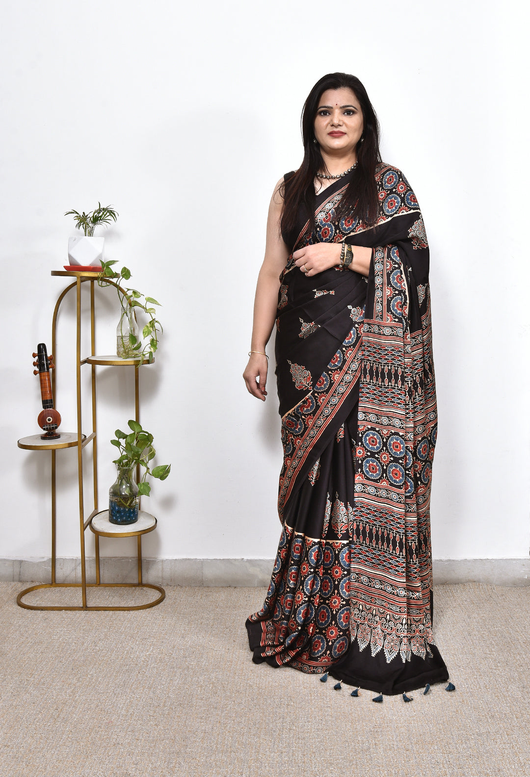 Ajrakh Silk Sarees are not just fabric , they are a masterpiece of Indian craftsmanship, a testament to the rich heritage of Kutch and Rajasthan. These sarees, are renowned for their intricate designs, vibrant natural dyes, and cultural significance, and are also a symbol of India's textile legacy. Unlike mass-produced alternatives, each Ajrakh saree is a unique creation, handcrafted with love and care by skilled artisans.