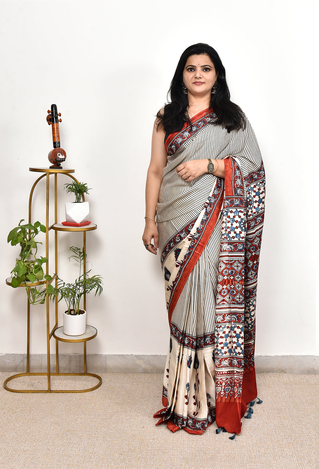 If you're looking for a saree that embodies elegance, sustainability and supports local artisans, then an Ajrakh Silk Saree is the perfect choice. Its regal charm, soft drape, and bold patterns make it an essential addition to every discerning woman's wardrobe. Now, you can easily buy Ajrakh Silk Sarees online directly from the artisans, ensuring you get authentic quality at the most affordable prices.