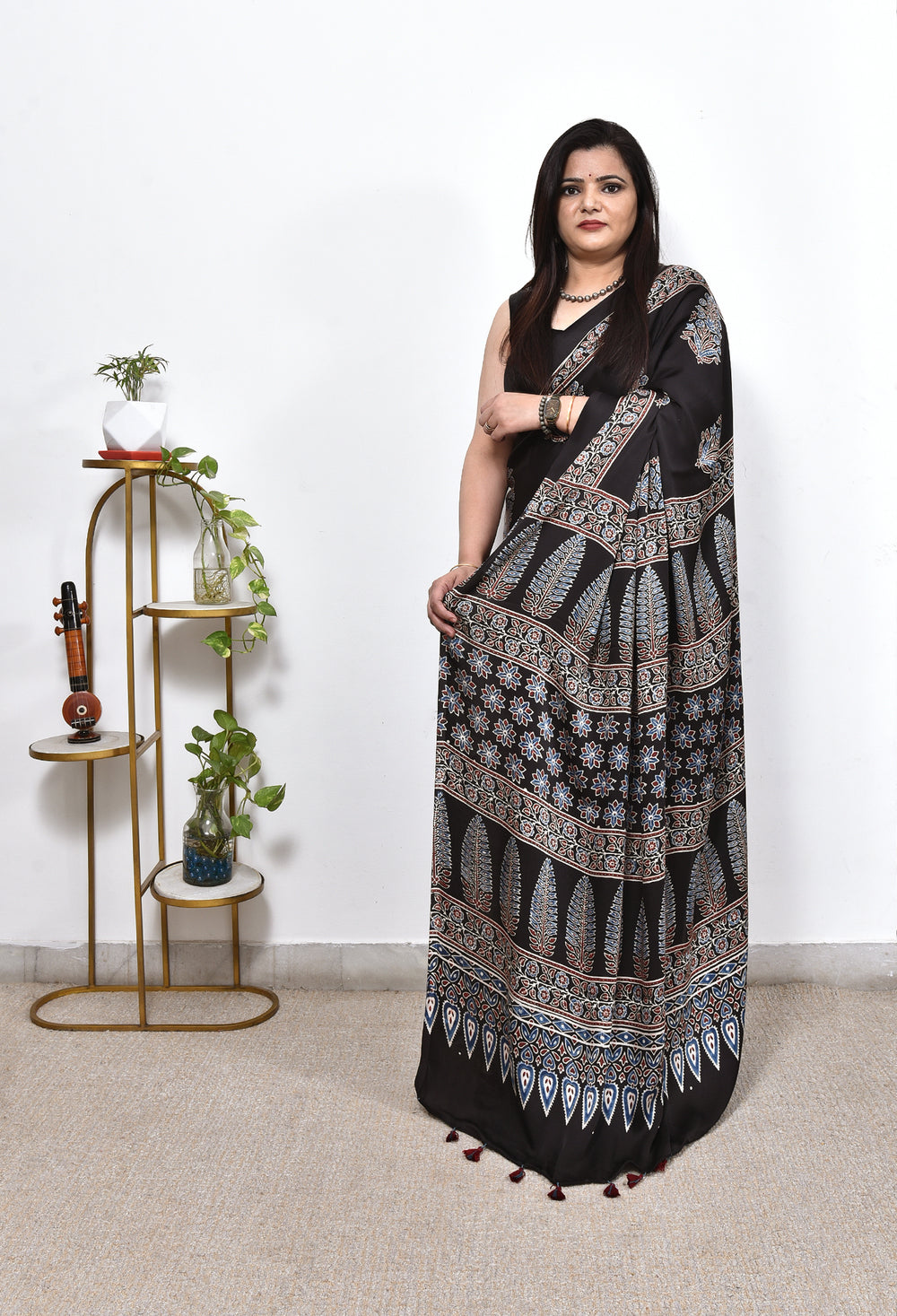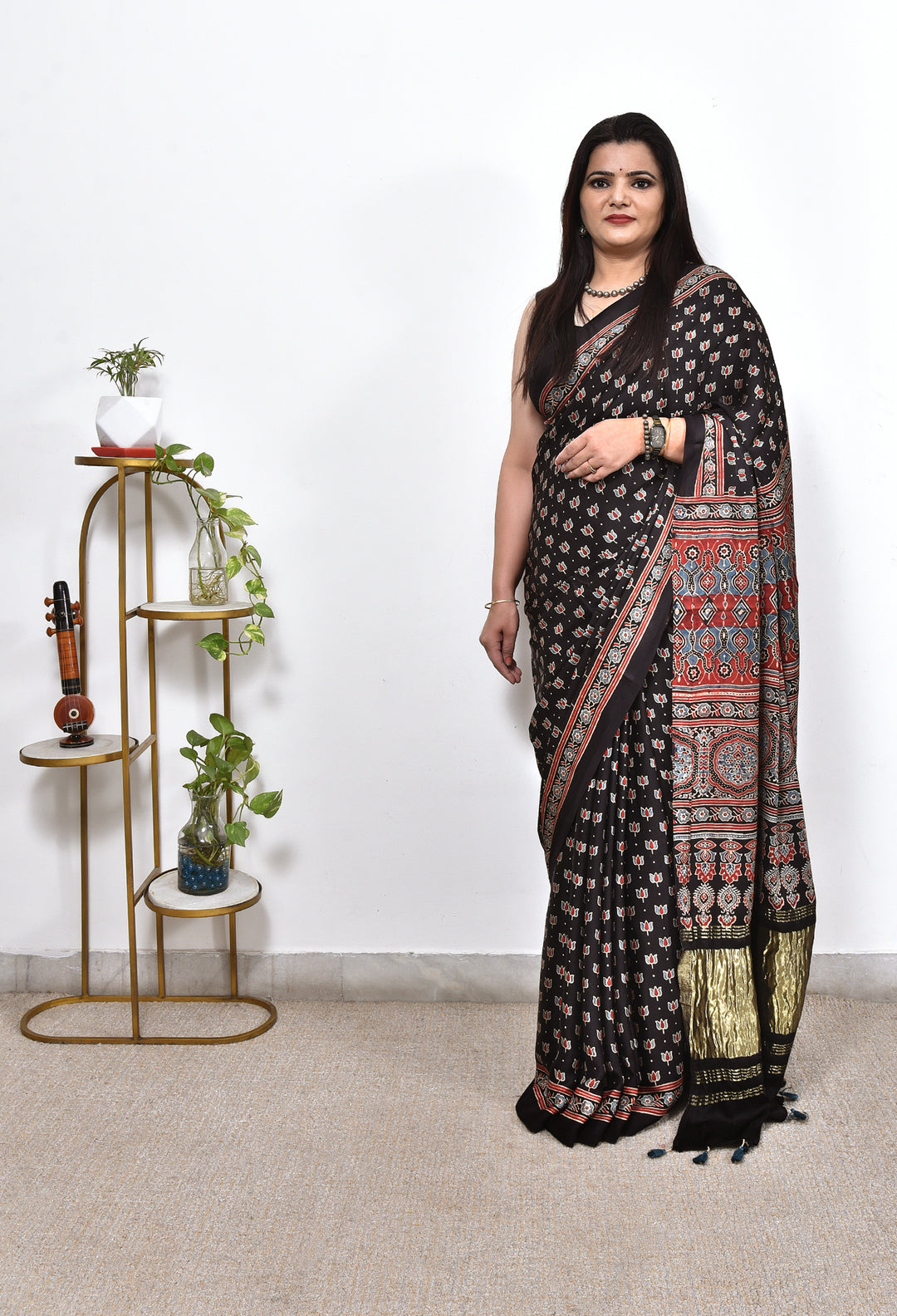 - Authenticity Guaranteed: Each Ajrakh Silk Saree is a unique creation, handcrafted with love and care. Buying directly from the artisans ensures you receive an authentic piece, reflecting the unique artistry of the creator.