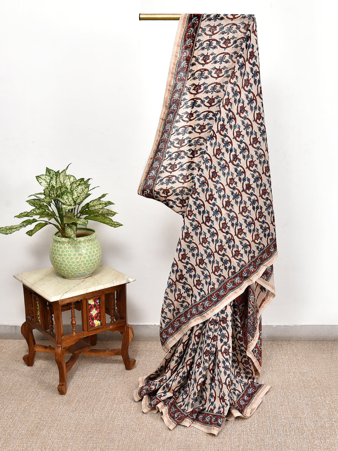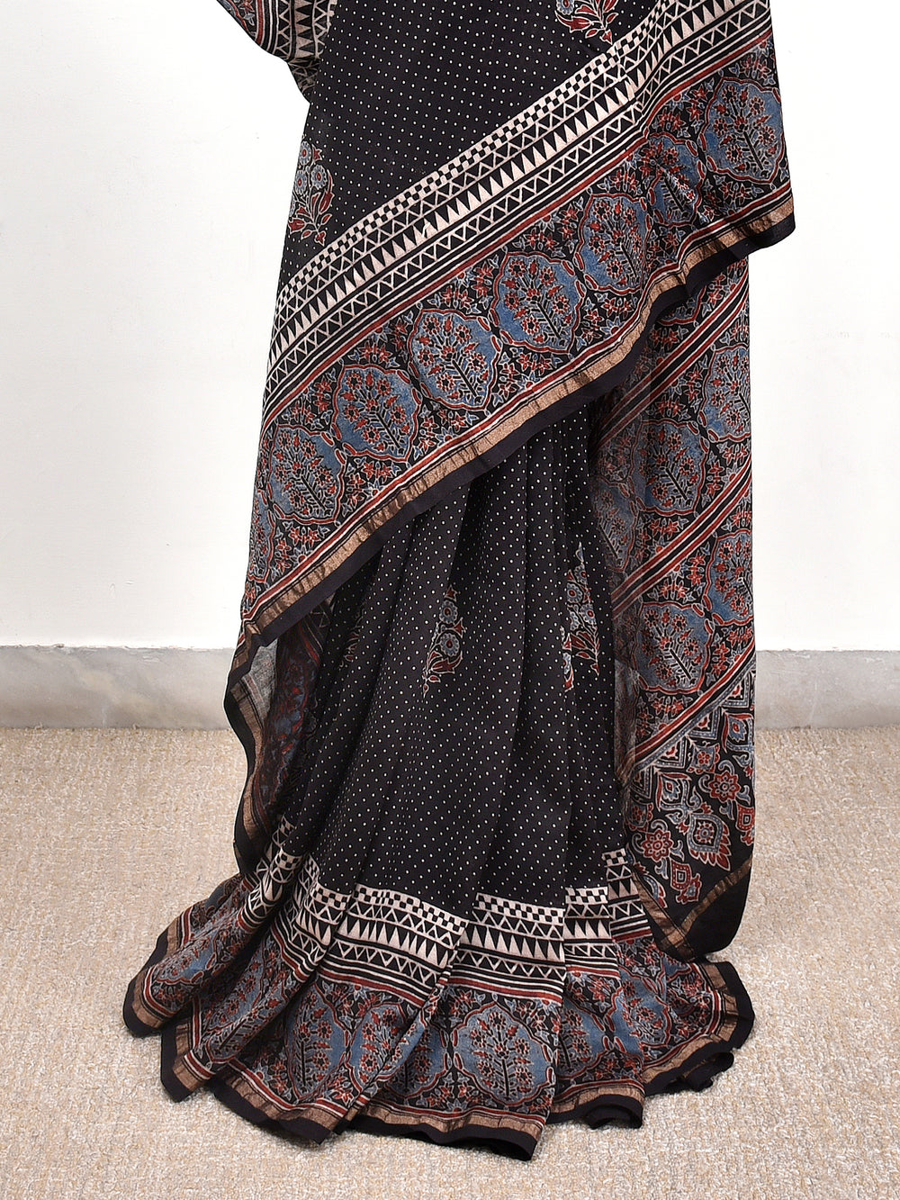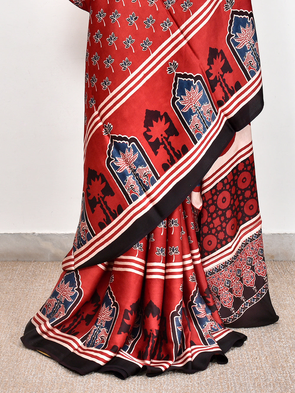Ajrakh Silk Sarees are not just fabric , they are a masterpiece of Indian craftsmanship, a testament to the rich heritage of Kutch and Rajasthan. These sarees, are renowned for their intricate designs, vibrant natural dyes, and cultural significance, and are also a symbol of India's textile legacy. Unlike mass-produced alternatives, each Ajrakh saree is a unique creation, handcrafted with love and care by skilled artisans.