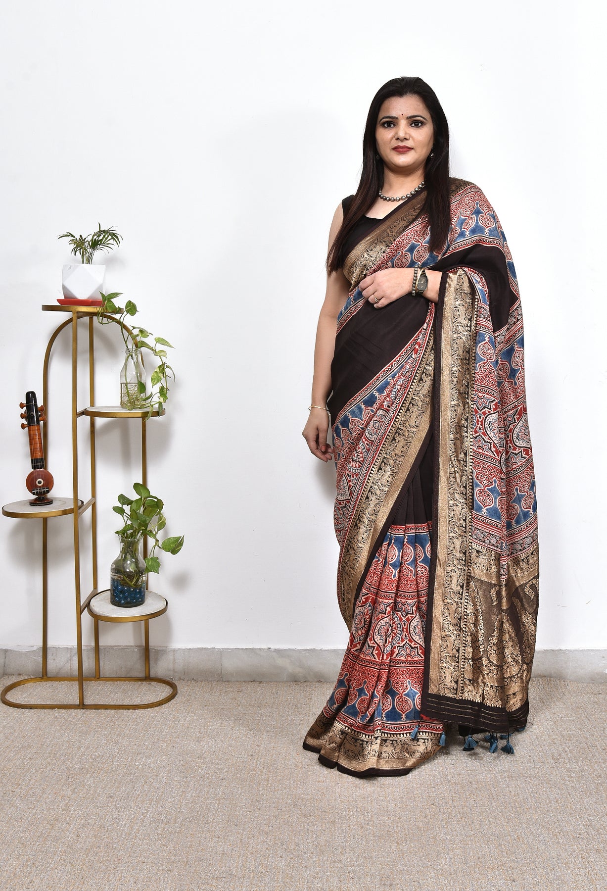 The highlight of this masterpiece is the intricate Nakshi Zari Pallu and shimmering zari border, adding a touch of regal splendour. Whether you're attending a wedding, a festive celebration, or a special occasion, this Ajrakh Silk Saree will make you the centre of attention.