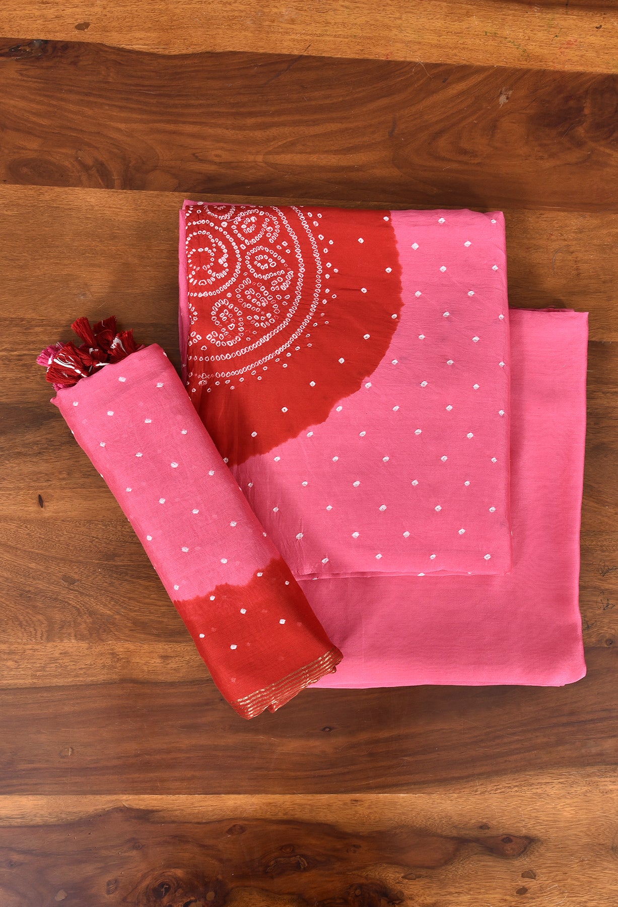 AABROO : HANDMADE BANDHANI CHANDERI SILK -COTTON 3 PIECE SUIT SET